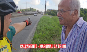 Histórico: No trecho entre o mercado Atacadão e a Expoville, o calçamento está totalmente incompatível para a circulação de pedestres e ciclistas, fazendo com que ambos tenha que utilizar a faixa de rolagem da marginal da BR 101, colocando em risco a vida dos passantes, pois tem que dividir o espaço com os veículos que lá trafegam . O Sr. Manuel, morador da rua Nestor Hintz , atrás do Atacadão, faz suas caminhadas todos os dias e tem medo de ser atropelado: “É uma vergonha ter que andar nesse trecho sem calçamento. Fico com medo, tenho que andar na pista, mas é a única forma de poder chegar na Expoville e poder dar minhas caminhadas diárias”, afirma seu Manoel.